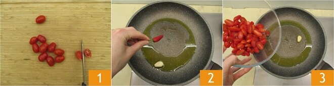 Para preparar la pasta con tomates cherry y gambas, primero lava bien los tomates y córtalos por la mitad a lo largo 1. En una sartén, vierte un chorrito de aceite, un diente de ajo y una guindilla 2. Deja que se aromaticen a fuego medio y cuando el ajo esté bien dorado, añade también los tomates 3.