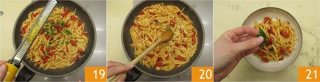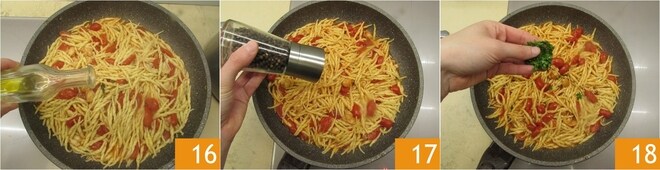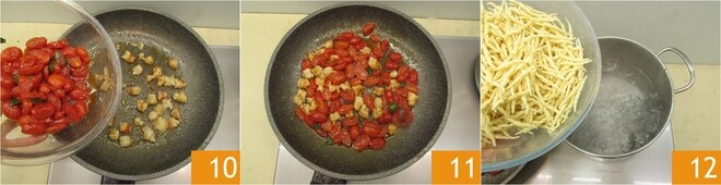 Ahora añade los tomates 10, salta todo 11 y apaga el fuego. Mantenlo apartado al calor y cuece las trofie en el agua que ya habrá alcanzado el punto de ebullición 12.
