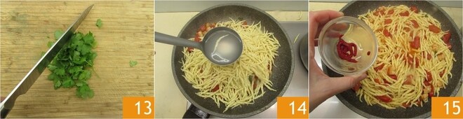 Pica también el perejil 13 y cuando las trofie estén cocidas, escúrrelas reservando un poco del agua de cocción. Transfiérelas a la sartén con los tomates y las gambas, añade un cucharón de agua de cocción 14 y saltea brevemente. Añade el concentrado de tomate 15 y vuelve a saltear.