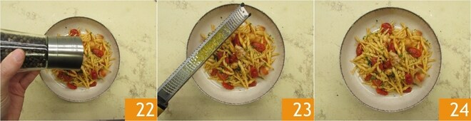 Añade de nuevo una pizca de pimienta 22, una pizca de cáscara de limón 23 y sirve tu pasta con tomates cherry y gambas 24!