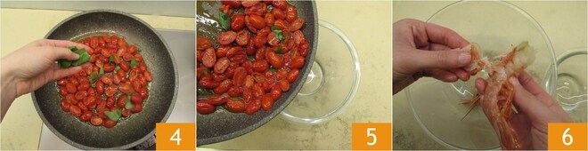 Súbelo a fuego alto y cocina los tomates por muy pocos minutos, hasta que suelten un poco de jugo. Retira el ajo y la guindilla, luego añade las hojas de albahaca rompiéndolas con las manos 4, una pizca de sal y transfiere los tomates a un bol 5. Resérvalos y mientras tanto pon a hervir el agua que servirá para cocer la pasta y salarla ligeramente. Luego Cómo limpiar los gambones eliminando la cáscara 6 y el filamento interno.
