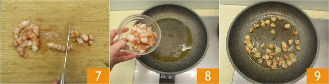 Corta las gambas en trozos de 1-2 cm 7. En la misma sartén en la que cocinaste los tomates, vierte otro chorrito de aceite y deja que se caliente. Añade las gambas 8 y saltéalas por pocos minutos, hasta que estén bien doradas 9.