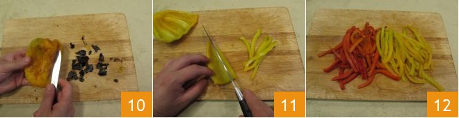 Cuando estén completamente pelados 10, cortadlos en tiras delgadas 11 haciendo lo mismo con ambos pimientos 12.