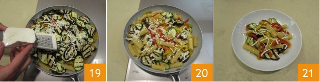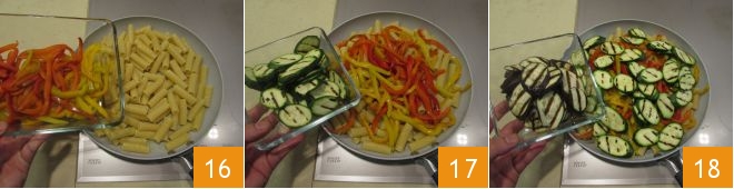 En la pasta añadid también las verduras asadas previamente, entonces los pimientos 16, los calabacines 17 y las berenjenas 18 y dejad que se mezclen todos los sabores durante unos instantes, cocinando a fuego vivo.