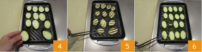 Calentad bien una parrilla, luego colocad las rodajas de berenjena primero, ya que tienden a oscurecerse rápidamente una vez cortadas 4 y dejadlas cocinar durante unos 30 segundos por cada lado 5. De esta manera quedarán ligeramente crujientes por fuera pero tiernas por dentro. Repetid con los calabacines, luego colocad las rodajas en la parrilla bien caliente 6