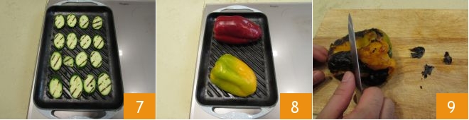y después de unos 30 segundos volteadlas para continuar la cocción por el otro lado 7. Reservad las dos verduras recién asadas y dedicad vuestra atención a los pimientos. Después de lavarlos y secarlos, asadlos en la parrilla hasta que estén bien tiernos y tostados 8: de esta manera podréis eliminar fácilmente la piel con un cuchillo pequeño, ya que es la parte más indigesta 9.