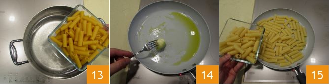 Coced la pasta en abundante agua hirviendo con sal 13 y mientras se cuece, verted un poco de aceite en una sartén junto con el ajo pelado y dejad que se insaporice durante unos minutos 14. Cuando la pasta esté cocida al dente, escurridla y vertedla en la sartén para dejar que se insaporice 15.