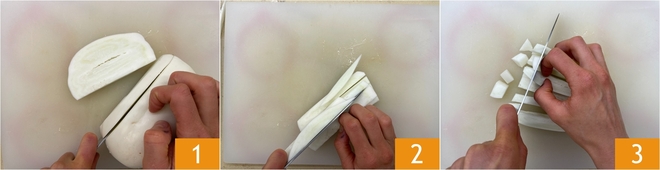 Para preparar la pasta con berenjenas en blanco cremosa, lavad, quitad los extremos y cortad las berenjenas en láminas 1, luego obtened tiras 2 y, por último, cubitos regulares de aproximadamente 1 cm 3.