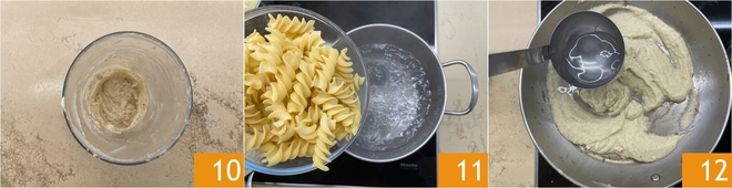Debéis obtener una crema lisa 10. Entretanto, coced la pasta el tiempo indicado en el paquete 11. Pasad la crema a la sartén y diluidla con un cucharón de agua de cocción de la pasta 12.