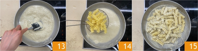 Mezclad hasta conseguir una textura fluida 13. Escurrid la pasta al dente directamente en la sartén 14, luego removédla bien para ligar y mantecarla 15.