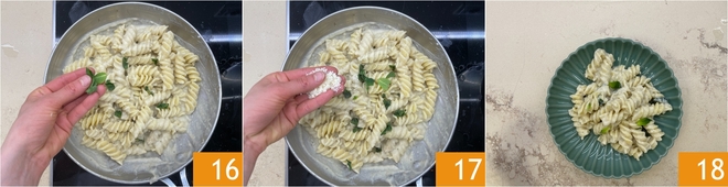 Aromatizad con unas hojas de menta fresca 16 y completad con Parmigiano Reggiano rallado 17. Servid enseguida vuestra pasta con berenjenas en blanco cremosa bien caliente 18.