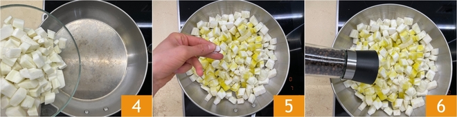 Pasad los cubitos de berenjena a una sartén 4, luego añadid aceite, sal 5 y pimienta 6.