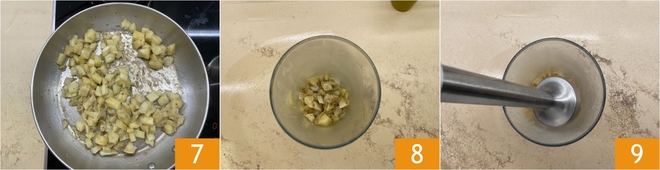Cocinad a fuego medio durante unos 10-15 minutos, o hasta que las berenjenas estén tiernas 7. Mientras tanto, poned al fuego una olla con abundante agua salada y llevadla a ebullición. Una vez cocinadas, pasad las berenjenas a un recipiente alto 8 y trituradlas con una batidora de mano junto con un cucharón de agua de cocción 9.