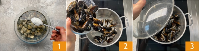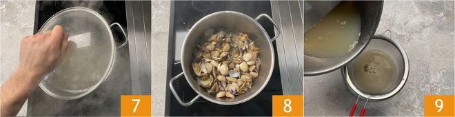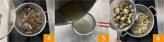 En aproximadamente 5 minutos estarán todos abiertos 4, escurrid y filtrad el líquido 5. Repetid la operación con las almejas: después de escurrirlas y enjuagarlas, echadlas en la sartén 6.