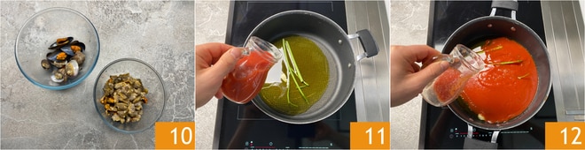 Reservad el líquido y cuando estén tibias podréis quitar las conchas conservando algunas para la decoración 10. En una cacerola calentad con un hilo de aceite el ajo y los tallos de perejil, verted el puré de tomate 11 enjuagando el envase 12.