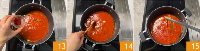 Unid el concentrado de tomate 13, mezclad y no añadáis sal 14. Serán necesarios aproximadamente 15 minutos; al final de la cocción retirad el ajo y los tallos de perejil 15.