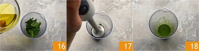 Luego preparad la salsa de perejil: echad las hojas en el vaso de una batidora, añadid el aceite 16 y batid 17 obteniendo una salsa lisa 18.
