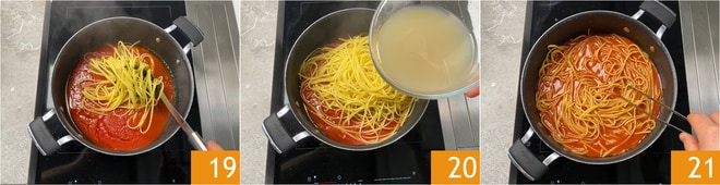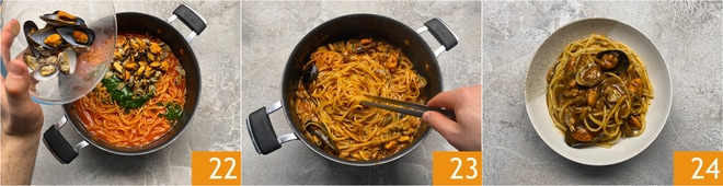 Coced las linguine en agua hirviendo pero no salada y escurridlas en el condimento 1-2 minutos después de la mitad del tiempo indicado en el paquete 19. Mojad con el agua filtrada de mejillones y almejas 20 y mezclad continuamente 21.