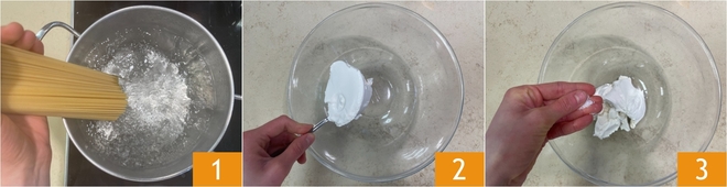 Para preparar la pasta cremosa de ricotta y azafrán, en primer lugar poned a hervir una olla con agua salada y coced los espaguettoni al dente 1. Mientras tanto, poned la ricotta en un cuenco amplio 2, añadid sal 3 y pimienta.