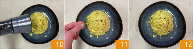 Completad con pimienta recién molida 10 y unas hojitas de salvia 11. ¡Vuestra pasta cremosa de ricotta y azafrán está lista para servir 12!