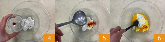 Añadid el azafrán 4 y un cucharón del agua de cocción de la pasta 5, luego mezclad todo 6 hasta obtener una crema suave y homogénea.