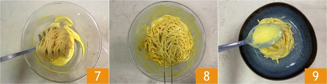 Transcurrido el tiempo de cocción, escurrid la pasta directamente en el cuenco 7 y mezcladla bien con la salsa 8; si es necesario, podéis añadir un poco más de agua de cocción. Emplatad los espaguettoni y cubridlos con abundante salsa 9.