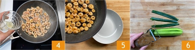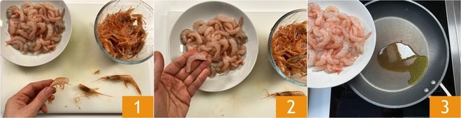Para preparar la pasta cremosa de calabacines y gambas empieza por limpiar las gambas: Retira delicadamente la cabeza con las manos 1, luego elimina también el caparazón y con la ayuda de un palillo saca el filamento interno 2. Procede de esta manera con todas las demás. Calienta una sartén, añade un poco de aceite y agrega las gambas 3. Saltéalas brevemente a fuego alto.