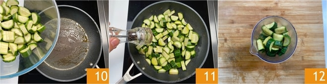 En la misma sartén donde cocinaste las gambas, añade un poco de aceite y agrega los calabacines 10. Condimenta con sal y pimienta 11. Cocina a fuego medio-alto durante 6-7 minutos, saltándolos de vez en cuando. Mientras tanto, pon al fuego una olla llena de agua con sal al gusto, que servirá para cocinar la pasta. Cuando los calabacines estén tiernos, pásalos a un recipiente alto y estrecho 12.