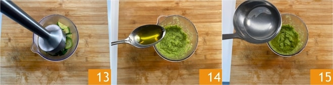 Tritúralos con una batidora de mano 13, añadiendo una cucharada de aceite en crudo y un par de cucharones de agua de la pasta 15.