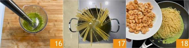 Tritura de nuevo hasta obtener una crema lisa 16 y devuélvela a la sartén. Mientras tanto, cocina las linguine y escúrrelas al dente; pasándolas directamente a la sartén.
