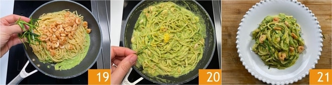 Añade las gambas y las tiras de piel de calabacín 19. Perfuma con ralladura de limón y hojas de tomillo 20. Saltea durante 2-3 minutos, termina la cocción y emplata 21. Decora con un poco de ralladura de limón y unas hojas de tomillo, y luego sirve enseguida tu pasta cremosa de calabacines y gambas.