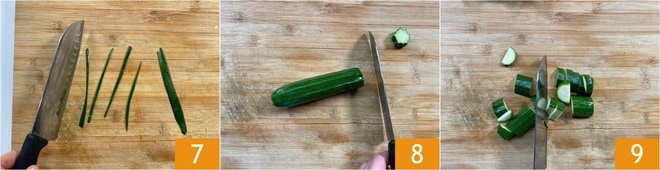 Corta la piel en tiras muy finas usando un cuchillo 7. Luego toma el otro calabacín, córtale la punta 8 y divídelo a la mitad a lo largo. Córtalo en rodajas, de modo que obtengas medias lunas 9. Haz lo mismo con el otro calabacín que habías pelado previamente.