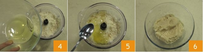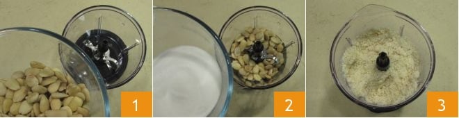 Para preparar las pastas de almendra, coloque en un procesador de alimentos con cuchillas de acero las almendras peladas 1 y el azúcar 2 y mezcle hasta reducirlas a polvo 3. Recuerde que este paso debe durar pocos minutos para evitar que las almendras se calienten demasiado y liberen su aceite.