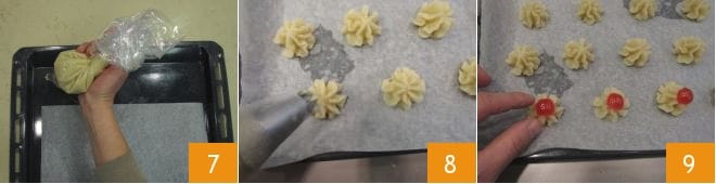Forre una bandeja de horno con papel de horno que puede fijar mejor exprimiendo un poco de masa en las 4 esquinas de la bandeja 7. Forme montoncitos de 3 cm de diámetro y unos 2 cm de altura 8 y decore parte de ellos con las cerezas confitadas cortadas por la mitad 9