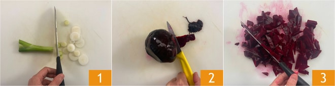 Para preparar la pasta de remolacha y gorgonzola, limpiad y cortad el cebollino 1. Pelad 2 y cortad en trozos la remolacha precocida 3.