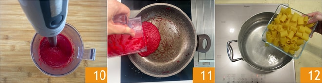 Debéis obtener una crema lisa y sedosa 10, transferidla a la sartén 11 y mientras tanto hervid la pasta 12.