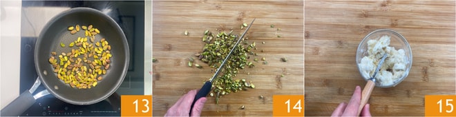 Tostad los pistachos en la sartén 13 y luego picadlos groseramente 14. Reservad. Ablandad el gorgonzola en un bol aplastándolo con el tenedor 15.