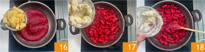 Escurrid la pasta al dente en el condimento 16 y con el fuego encendido añadid aproximadamente la mitad del gorgonzola 17. Cuando el gorgonzola esté completamente derretido e incorporado y la pasta bien condimentada, con el fuego apagado añadid el resto del gorgonzola 18.