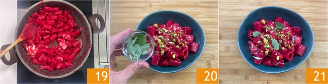 Mezclad brevemente 19, de modo que el queso no se derrita completamente. Servid con pistachos picados y hojitas de salvia 20. Servid enseguida la pasta de remolacha y gorgonzola 21.