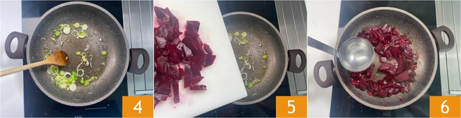 En la sartén, haced un sofrito de aceite y cebollino en rodajas 4. Añadid la remolacha 5. Saltead y dejad dorar durante unos minutos, luego añadid un cucharón de agua 6 y coced durante 20 minutos, añadiendo más agua si es necesario.