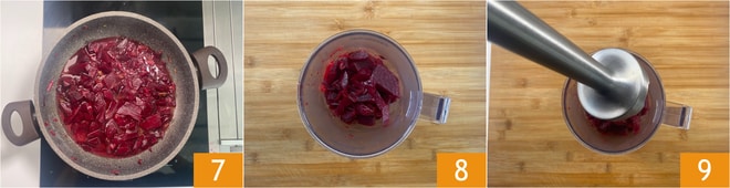Una vez lista la crema 7, transferidla a un recipiente alto 8 y triturad muy finamente con la batidora de mano 9, añadiendo agua si es necesario.