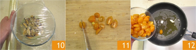 Cubre y reserva 10. Corta los tomatitos en cuartos 11. Calienta otros dos dientes de ajo con un poco de aceite y añade aquí los tomatitos 12. Sofríe a fuego alto durante 5 minutos.