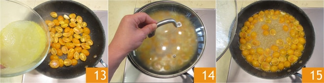 Vierte el agua de los mariscos 13, baja el fuego, cubre con la tapa 14 y cocina durante 10 minutos 15.