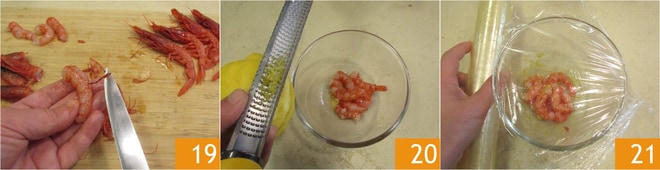Ahora limpia las gambas rojas 19 previamente congeladas, elimina la cabeza y el caparazón, luego colócalas en un bol a marinar con ralladura de limón 20, sal, pimienta. Reserva en el frigorífico 21.