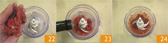 Toma las cabezas de las gambas, elimina los ojos y colócalas en una batidora 22, añade un chorrito de aceite y tritúralas 23 24.
