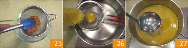 Cuela los restos triturados con un colador y reserva 25. Mientras tanto, cuela también la salsa de tomate y recógela en una cazuela 26, añade agua hirviendo para alargar la salsa 27.