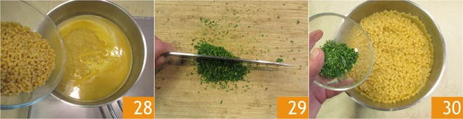 Cocina los ditalini en la salsa 28, durante el tiempo indicado en el paquete. Mientras tanto, pica las hojas de perejil 29 y cuando la pasta esté cocida, agrégala a la cazuela 30.