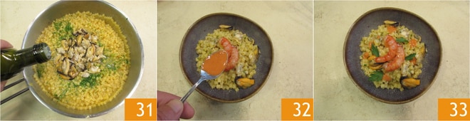 Añade los mariscos, un chorrito de aceite 31 y emplata acompañando con las gambas marinadas y el concentrado triturado de los restos 32. La pasta de verano con mariscos está lista 33.