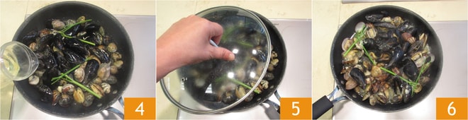 Desglasa con el vino 4, cubre con la tapa y deja que las conchas se abran a fuego alto 6.