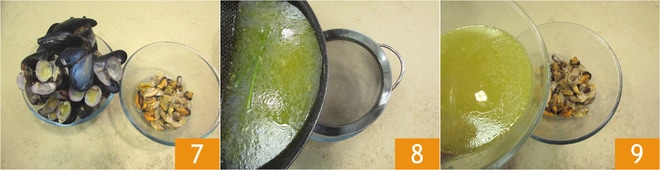 Desconcha los mariscos 7, filtra su agua de cocción 8 y rocía los mejillones y almejas desconchados con parte del líquido 9.